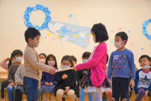 4月10日に入園・進級式を行いました。 新しいクラスでの初めての行事です。 うみ組(2歳児)、もり組(3歳児)、そら組(4歳児)、にじ組(5歳児)が参加し、新入園児と園児代表が賞状を受け取りました。 新しい環境にまだにま…[続きを読む]