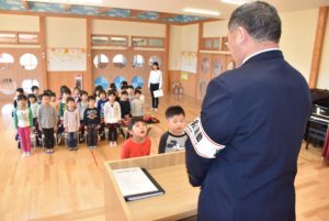 4月10日に入園・進級式を行いました。 新しいクラスでの初めての行事です。 うみ組(2歳児)、もり組(3歳児)、そら組(4歳児)、にじ組(5歳児)が参加し、新入園児と園児代表が賞状を受け取りました。 新しい環境にまだにま…[続きを読む]